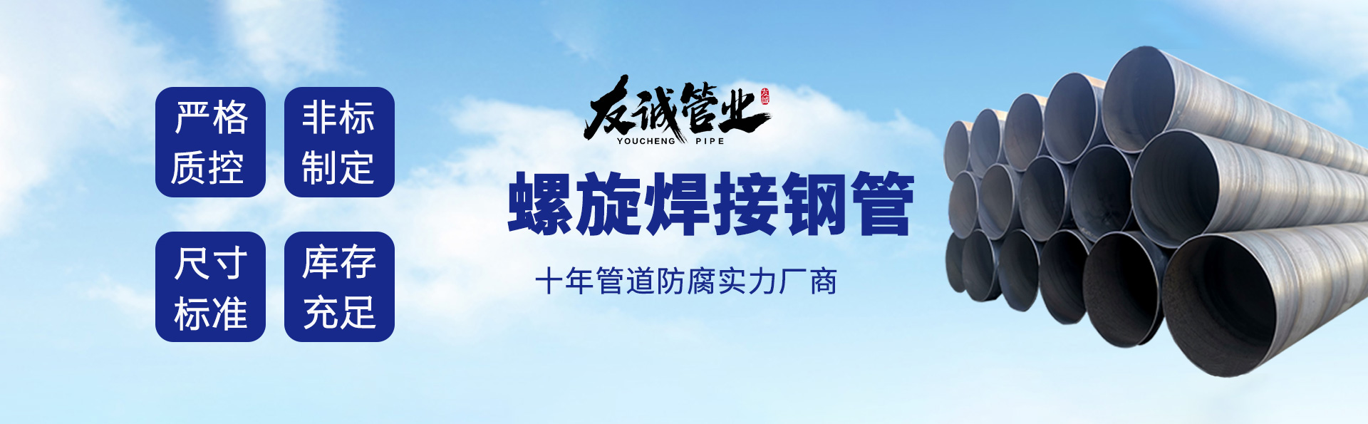 滄州友誠管業有限公司是一家專業從事生產防腐涂塑管道及管件于一體的大型企業。公司注冊資金8600萬元,位于中國管道生產基地—河北鹽山縣,近靠京滬高速、榮烏高速、黃石高速30公里,高鐵滄州西站40公里,天津國際機場、濟南遙墻機場150公里,為客戶來訪及業務發(fā)展提供了便利的交通條件。        鋼管系列:螺旋鋼管、無縫鋼管、ERW直縫焊管、JCOE埋弧焊直縫鋼管、熱鍍鋅鋼管。        涂塑系列:內外涂塑鋼管、涂塑復合鋼…… 了解更多